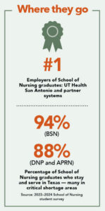 The School of Nursing has long been known for its rigorous curriculum and deeply immersive clinical education within a complex care environment. Today, it’s also a powerful engine for South Texas’ nursing workforce, producing graduates who are sought after for their readiness, resilience and professionalism.